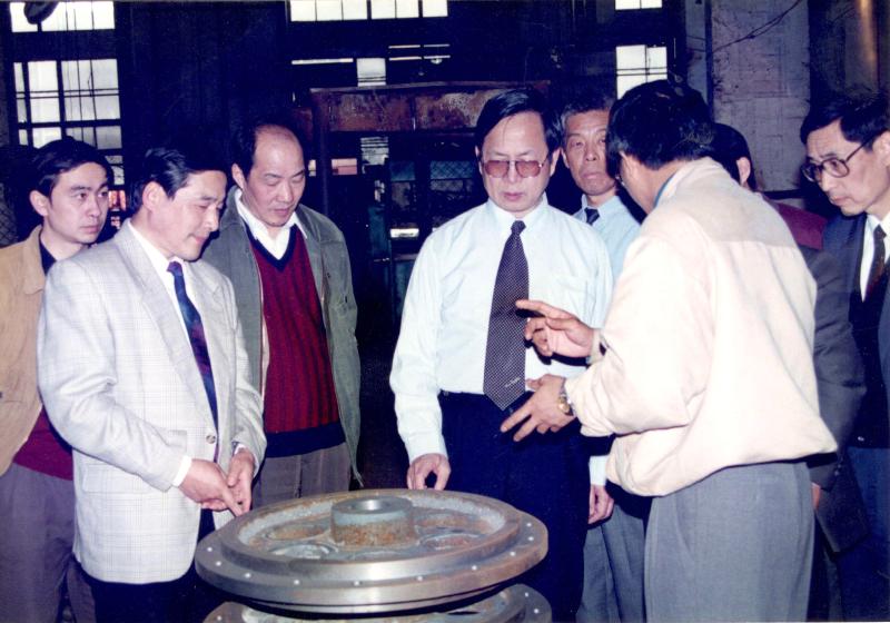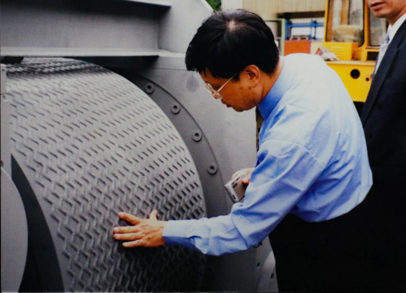 1999年,合肥院技術(shù)專家和領(lǐng)導(dǎo)們出國考察交流學(xué)習(xí)。圖為粉磨專家包瑋在研究輥壓機(jī)設(shè)備。